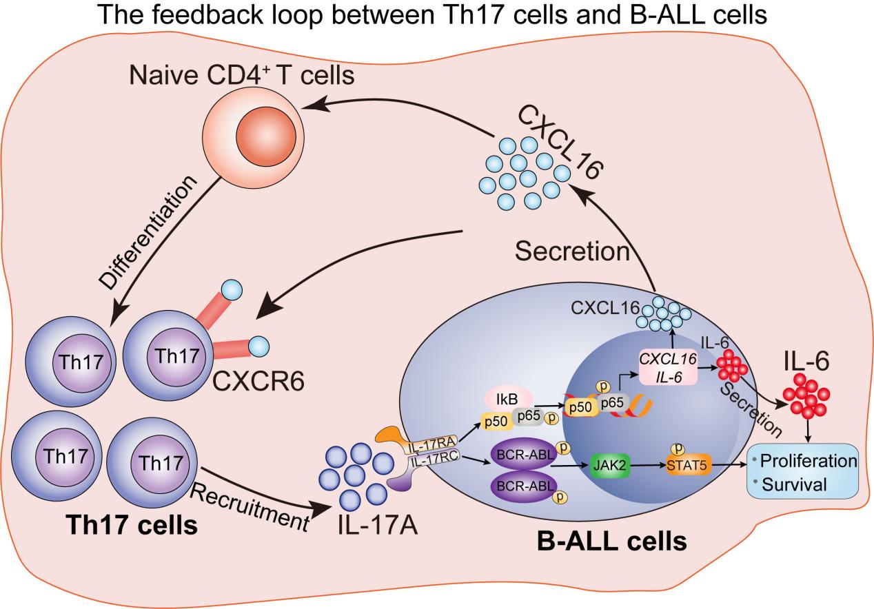 该研究团队首先检测正常人骨髓样本和Ph+B-ALL骨髓样本中Th17细胞的比例,发现Th17细胞的比例在Ph+B-ALL病人样本中呈现高表达,并且Th17细胞分泌的白介素17A因子(IL-17A)在Ph+B-ALL病人血清中也明显升高。随后在自发B-ALL的转基因小鼠(BCR-ABLtTA)模型上也得到类似结果。IL-17A能够促进B-ALL细胞的增殖,给予IL-17A能够明显加速白血病疾病进程,而敲除IL-17A或者使用抗IL-17A中和抗体能够明显抑制B-ALL疾病进程。进一步研究发现,IL-17A通过激活BCR-ABL、JAK/STAT和NF/KB信号通路来维持B-ALL细胞的增殖和CXCL16因子的分泌。而白血病细胞分泌的CXCL16因子能够进一步促进Th17细胞募集到白血病微环境,Th17细胞与白血病细胞Niche的形成在介导B-ALL疾病发生发展中发挥重要作用。使用抗IL-17A或抗CXCL16中和性抗体能够破坏白血病骨髓等部位干性微环境的形成,进而抑制Ph+ B-ALL的疾病进展。本研究揭示了IL-17A或CXCL16作为干预Ph+ B-ALL潜在治疗靶点,验证了抗IL-17A或抗CXCL16抗体联合伊马替尼的抗Ph+ B-ALL治疗效果,为Ph+ B-ALL的治疗提供新思路和干预新策略。
