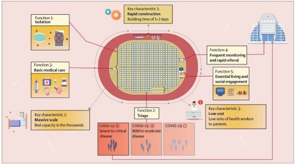 方舱庇护医院具有三个主要特点,使其尤其适合于应对武汉市新冠肺炎疫情这样的突发公共卫生事件(图3)[33]。
